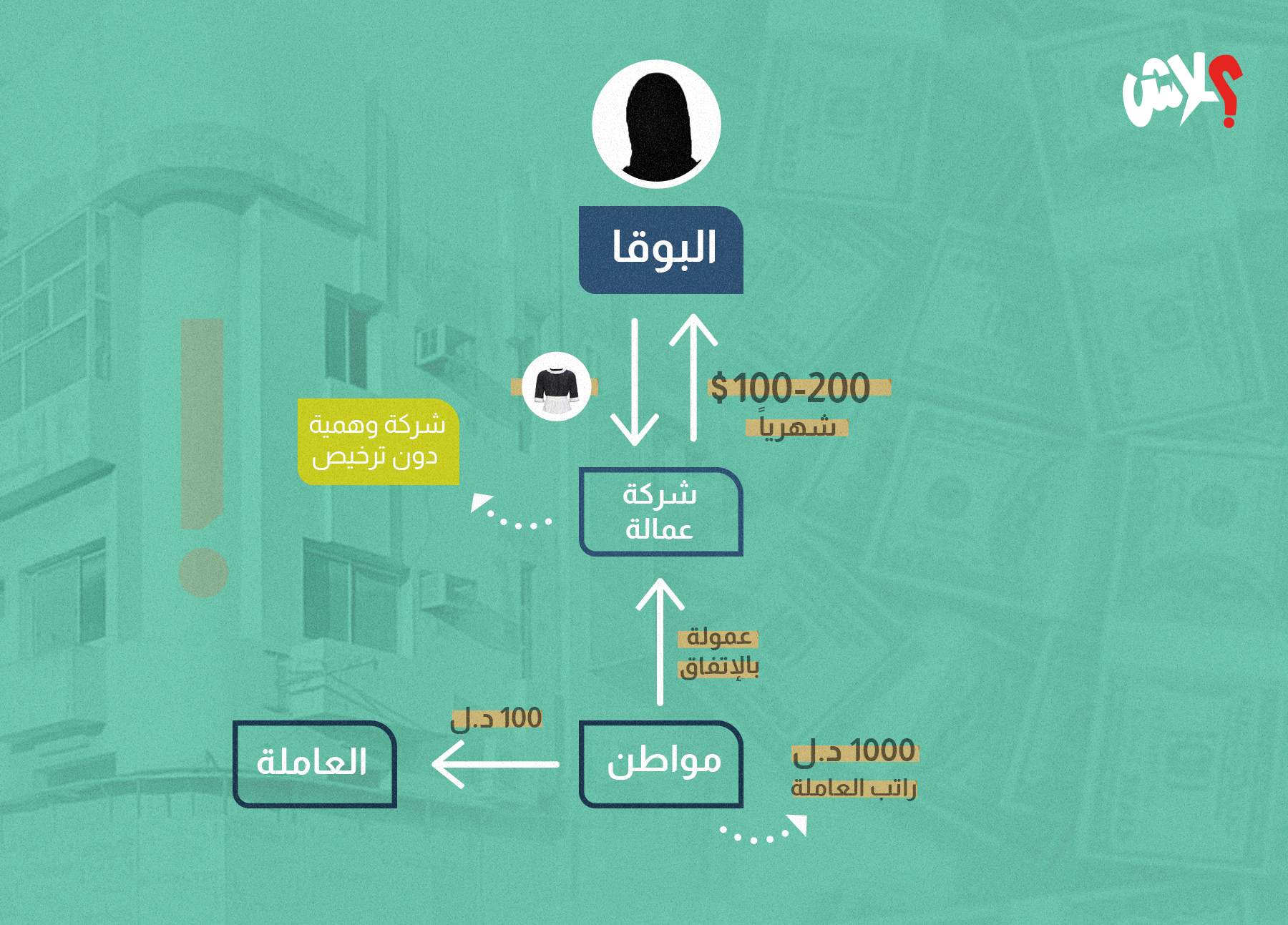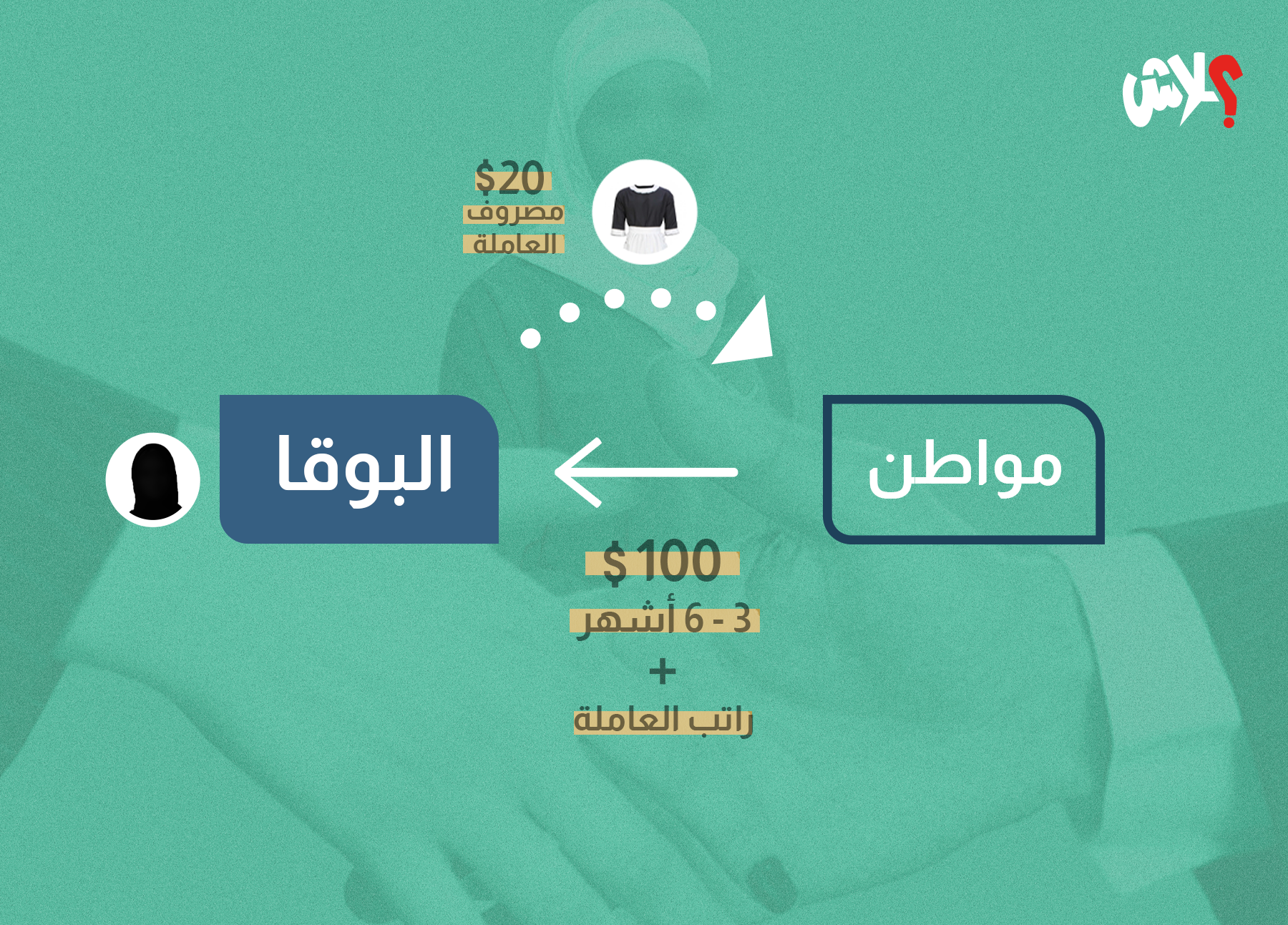The worker’s salary is divided as follows: an average monthly wage of 1,000 dinars (200 USD), of which the worker sometimes receives only 100 dinars (20 USD). The rest goes to the Boga and the company, in addition to a “tax” paid by the company to the Boga for a period of three to six months, and sometimes up to a year, depending on the worker’s nationality and demand in the labor market.