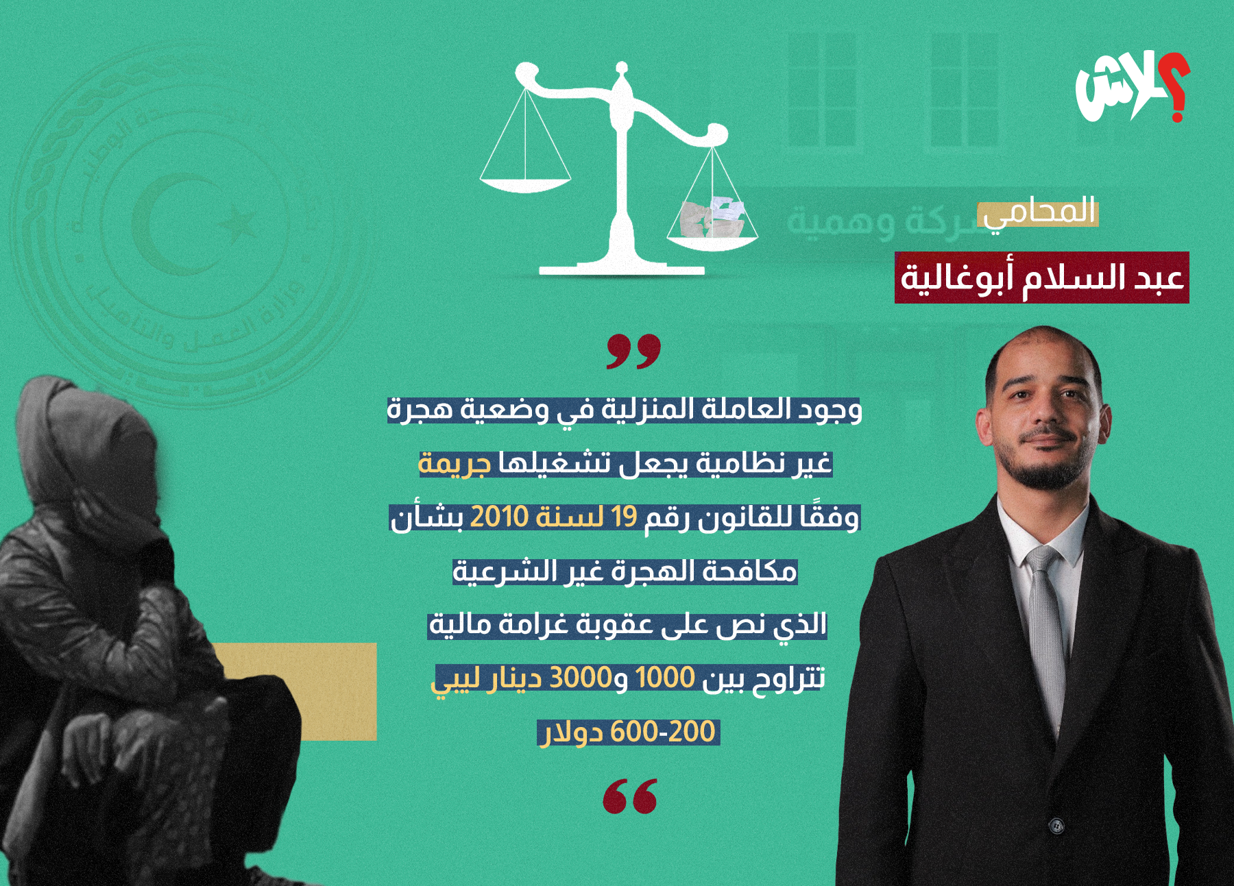 “A domestic worker in a situation of irregular migration makes her employment a crime under Law No. 19 of 2010 on Combating Illegal Migration, which imposes a fine of 1,000–3,000 Libyan dinars (200–600 USD) on any employer or company that hires irregular migrants. Since the worker’s presence in Libya is illegal, she is not legally capable of entering into contracts, making commitments, or undertaking valid legal actions. As a result, her rights financial or otherwise may be legally unenforceable under prevailing interpretations.”
